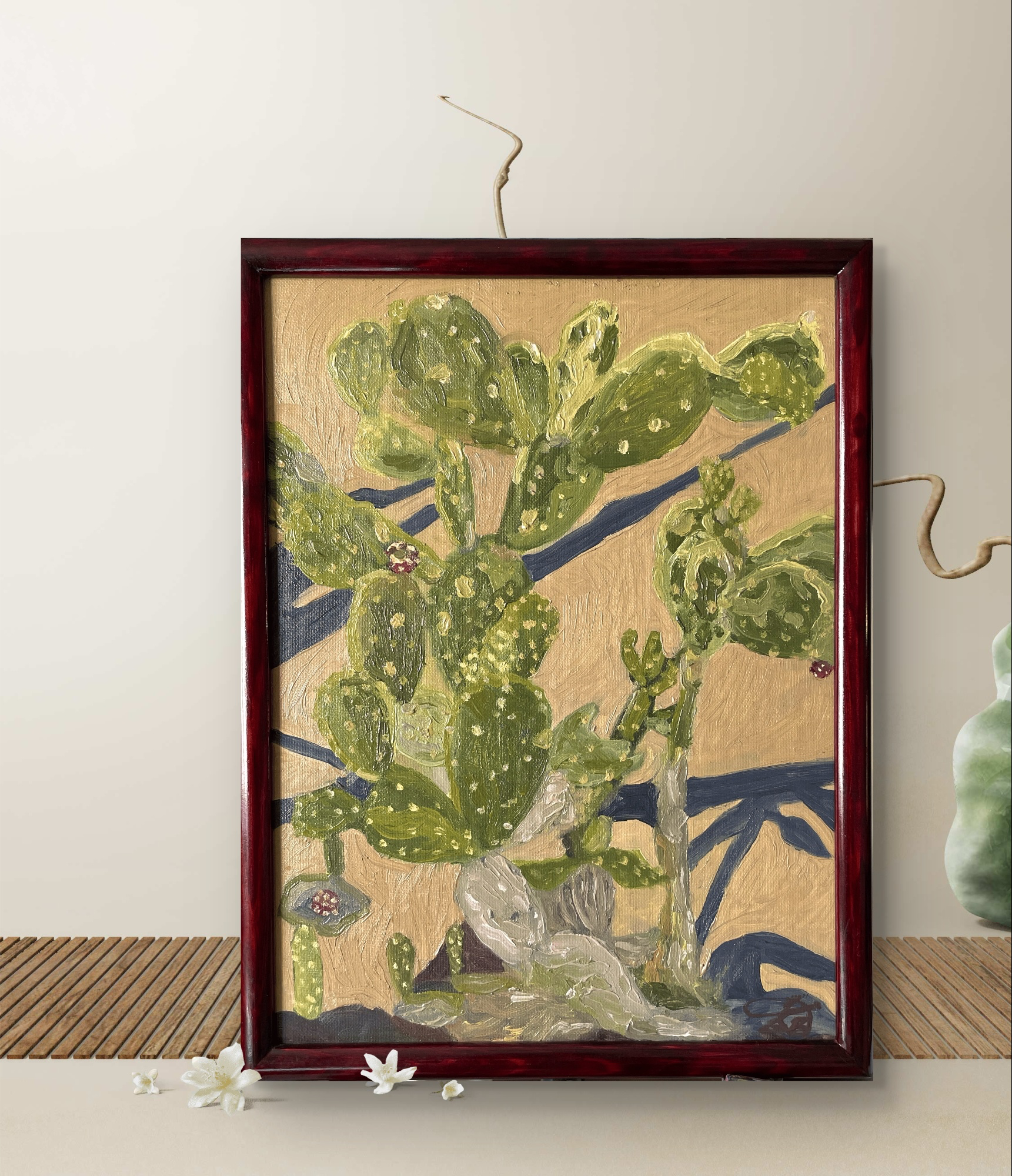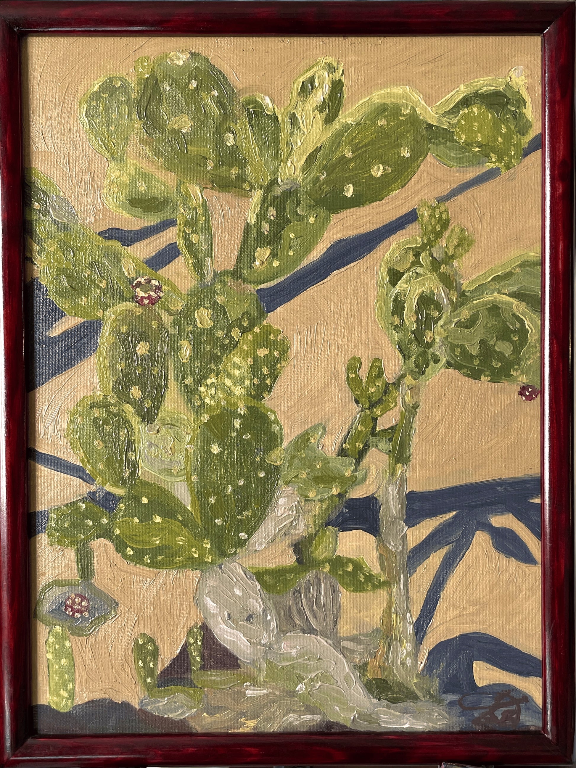 Las nopaleras siempre me han parecido un símbolo poderoso. Crecen entre espinas, en suelos áridos, resistiendo el sol con una fuerza silenciosa… y aún así, florecen. Por eso decidí llamar a este cuadro “Vida Nopalera”.